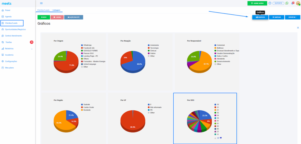 Agora, na tela de Clientes/Leads, você conta com o gráfico de DDD.