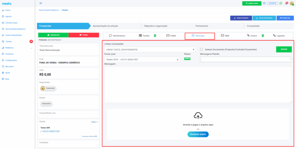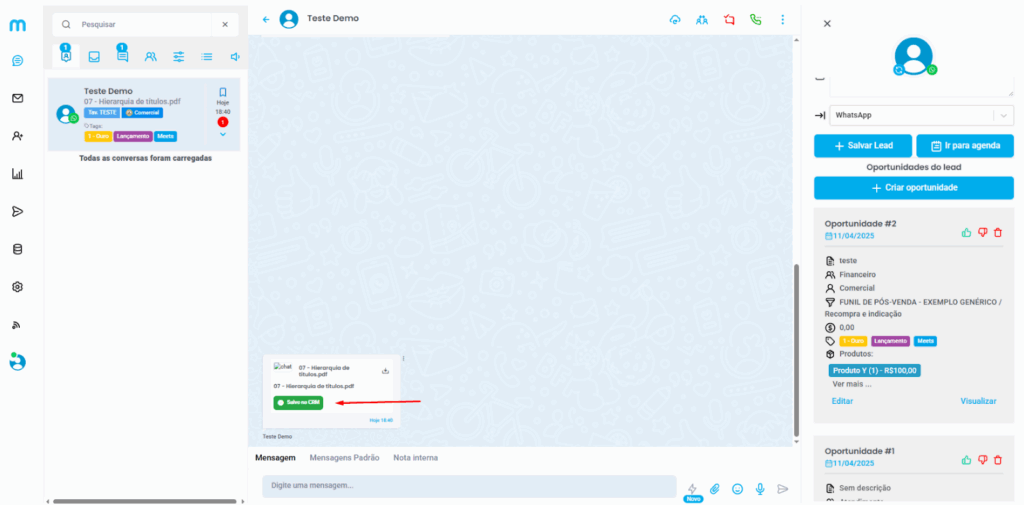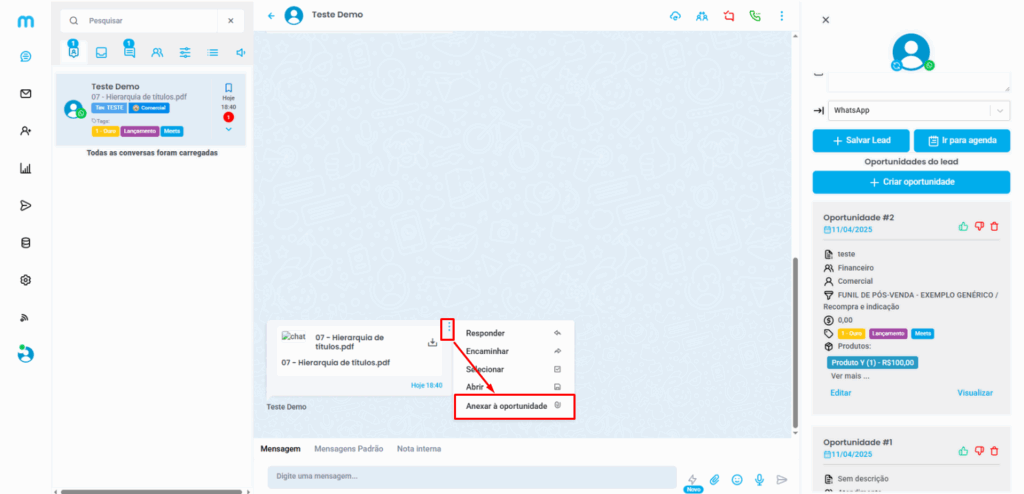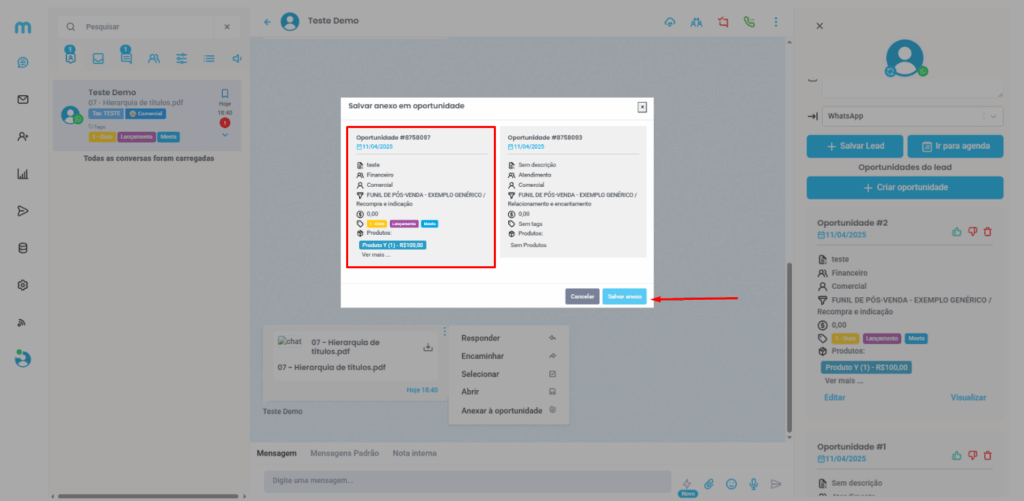 Na Central de Atendimento, você pode salvar anexos direto na oportunidade, sem sair da conversa. E o melhor: é possível escolher em qual oportunidade salvar e visualizar tudo que já está guardado ali.