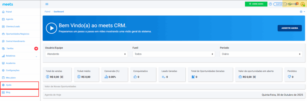 Agora o conhecimento está a um clique de distância: os botões para o Ajuda.Meets e o Blog.Meets estão no menu lateral do CRM.