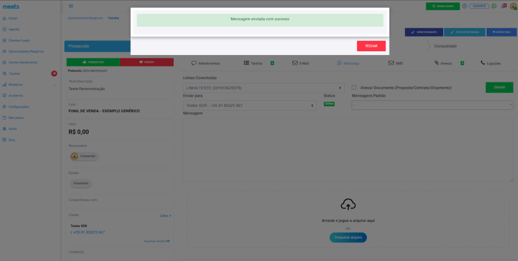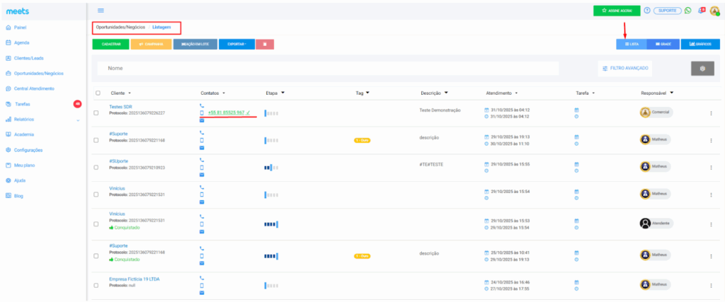 Agora, você pode clicar no número do lead diretamente na tela de Oportunidades (modo lista) e abrir o envio de mensagem no WhatsApp, sem precisar sair do CRM. Menos cliques, mais conversa.