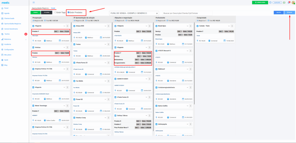 Na visão em Grade das Oportunidades, é possível habilitar a exibição dos produtos dentro dos cards — com nome, valor e quantidade. Mais contexto, menos cliques.
