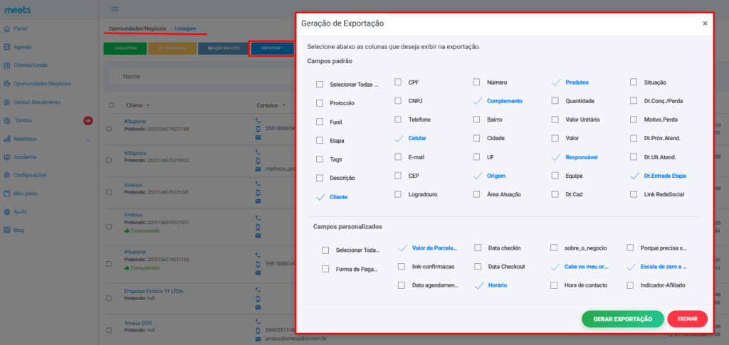 Na exportação de dados de Clientes e Oportunidades, ficou mais fácil selecionar exatamente o que você quer levar no arquivo. Os campos personalizados agora aparecem destacados e você escolhe quais exportar.