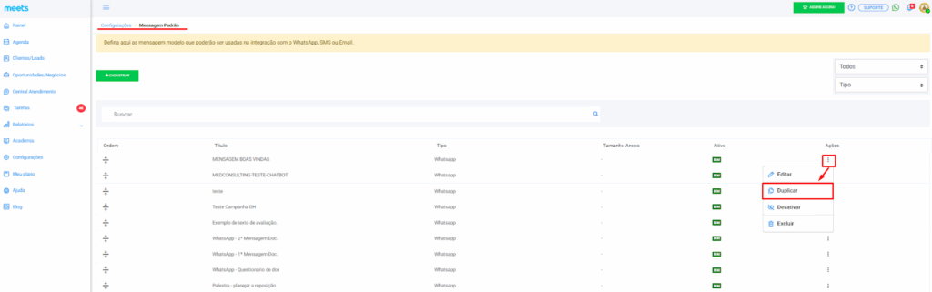 Criar novas mensagens ficou mais prático: basta duplicar uma já existente e editar o que quiser — sem perder o conteúdo original.
