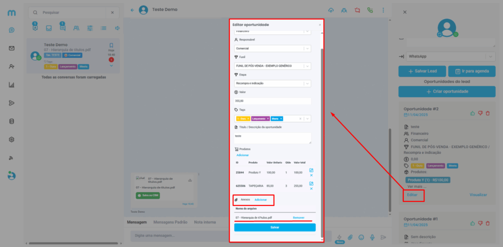 Além disso, é possível visualizar também os anexos que já estão salvos na oportunidade.