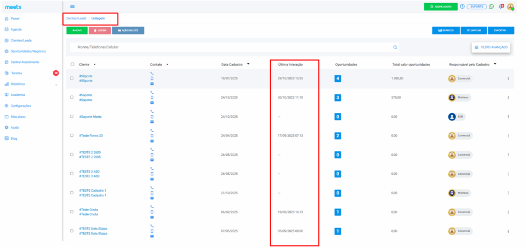 Adicionamos uma coluna com a data da última interação na tela de Clientes/Leads. Assim, você sabe exatamente quando foi o último contato — e evita deixar um lead “esfriar”.