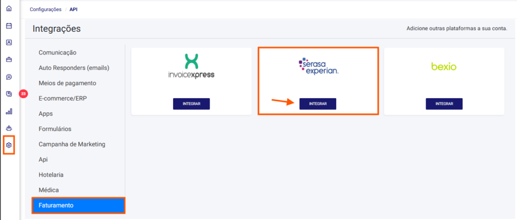 A integração com o Serasa permite realizar consultas de crédito diretamente no cadastro do cliente ou lead dentro do CRM. Com isso, é possível analisar o risco em tempo real sem precisar acessar outras plataformas, tornando o processo mais rápido e centralizado.